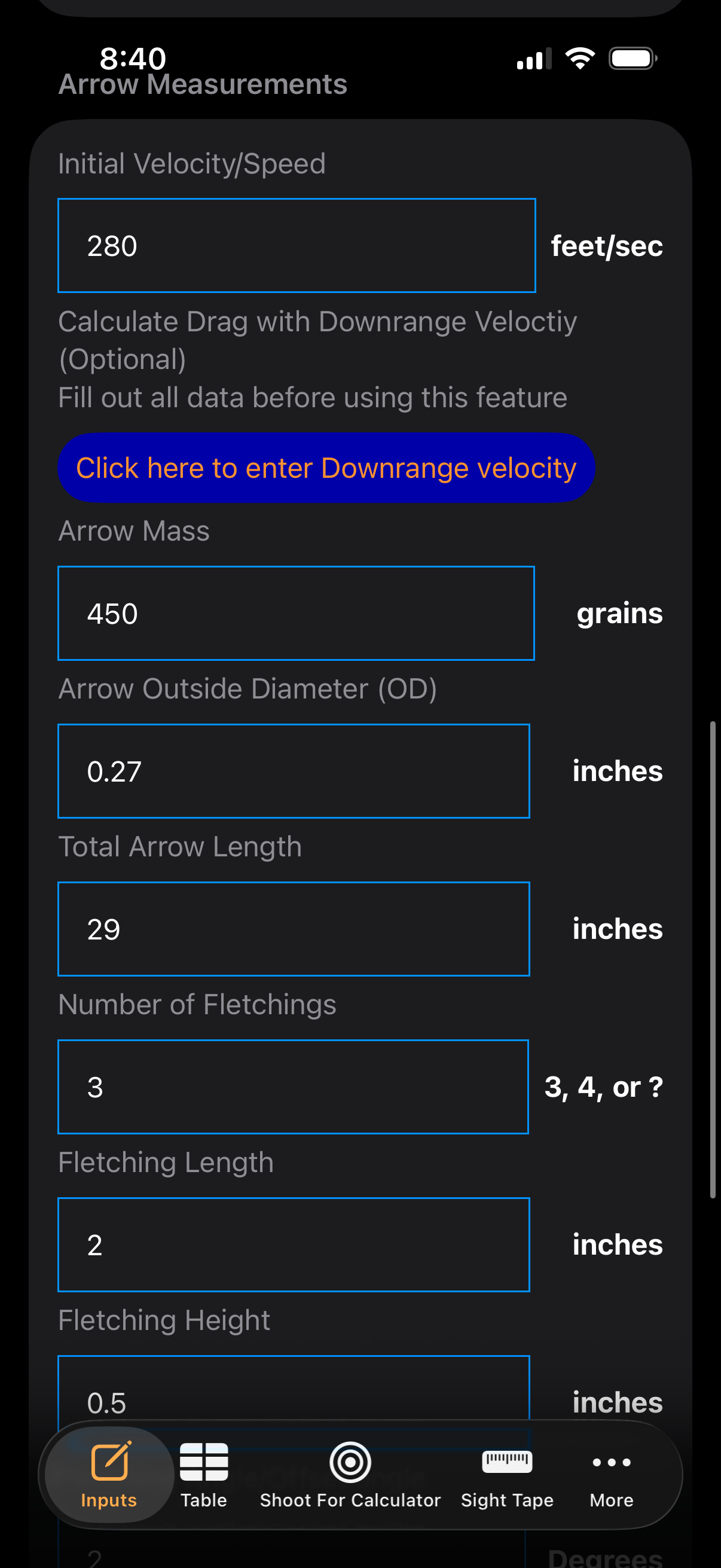 - Fill out all arrow fields first, then enter downrange speeds.